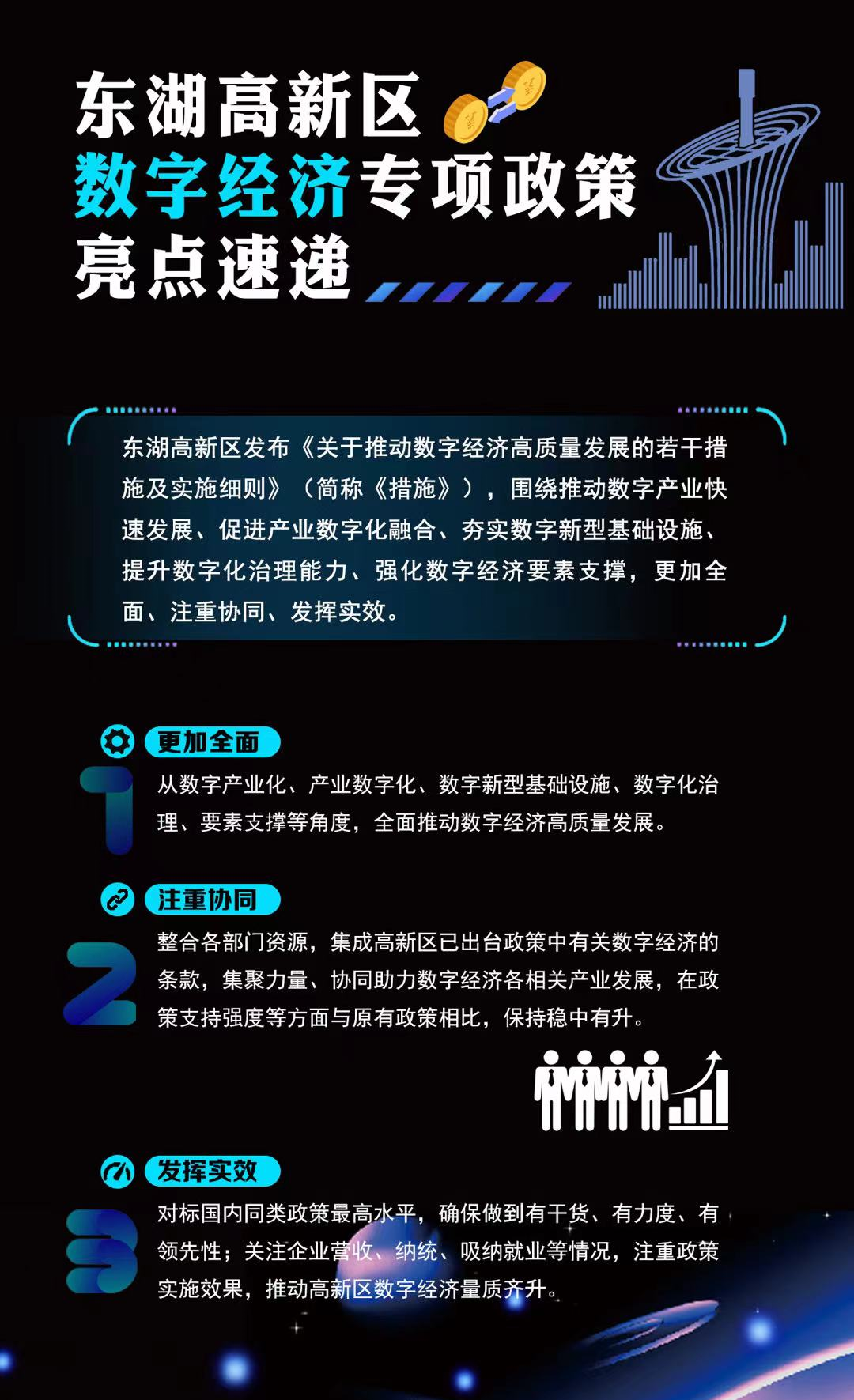 該政策涵蓋數字產業化、產業數字化、數字新型基礎設施、數字化治理、數字經濟要素支撐五方面,共20項細化條款,對標國內同類最高水平,支持力度穩中有升。