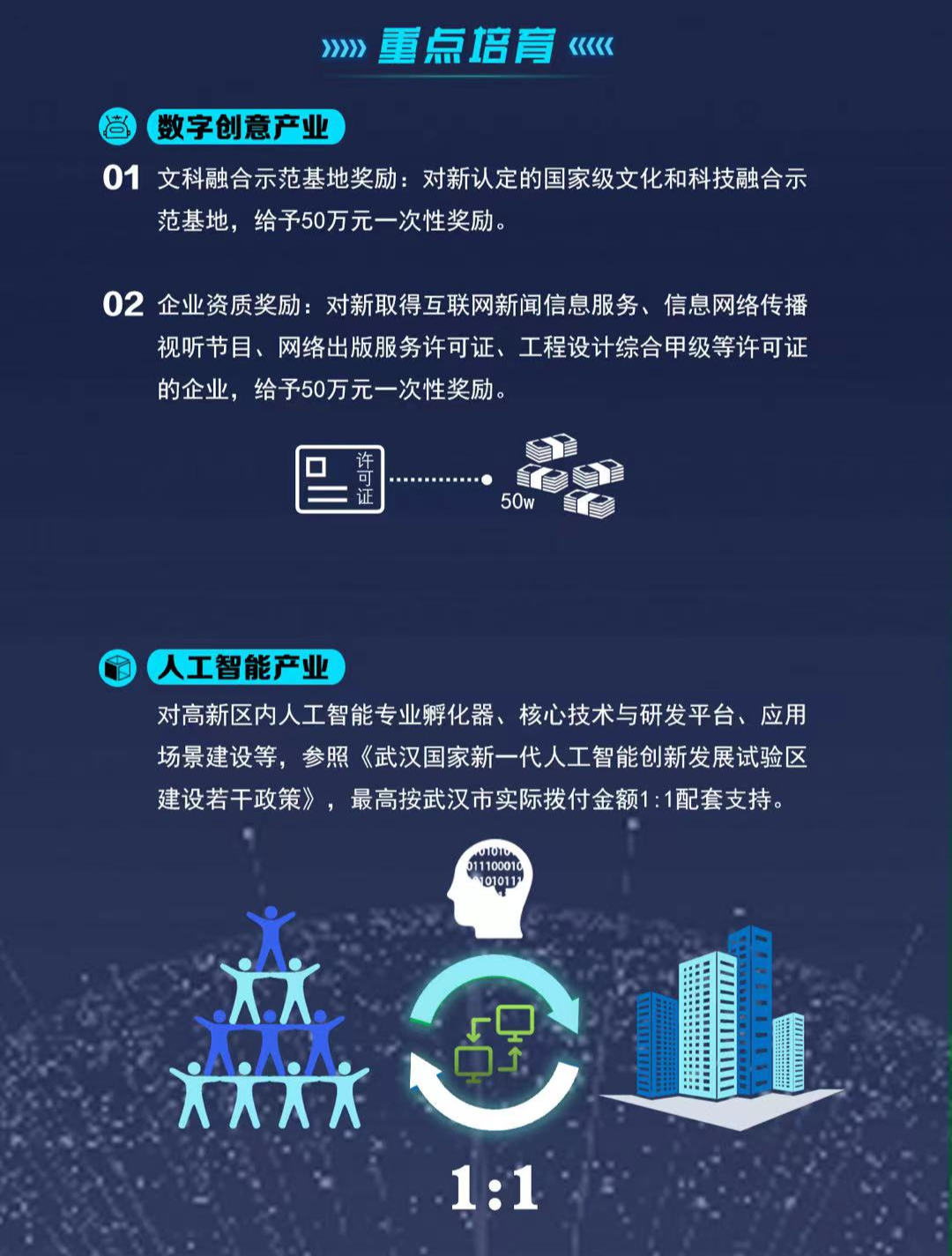 在促進人工智能產業發展方面,對符合要求的人工智能專業孵化器、核心技術與研發平臺、應用場景建設,實行市區聯動支持,最高按武漢市實際撥付金額1:1配套支持。