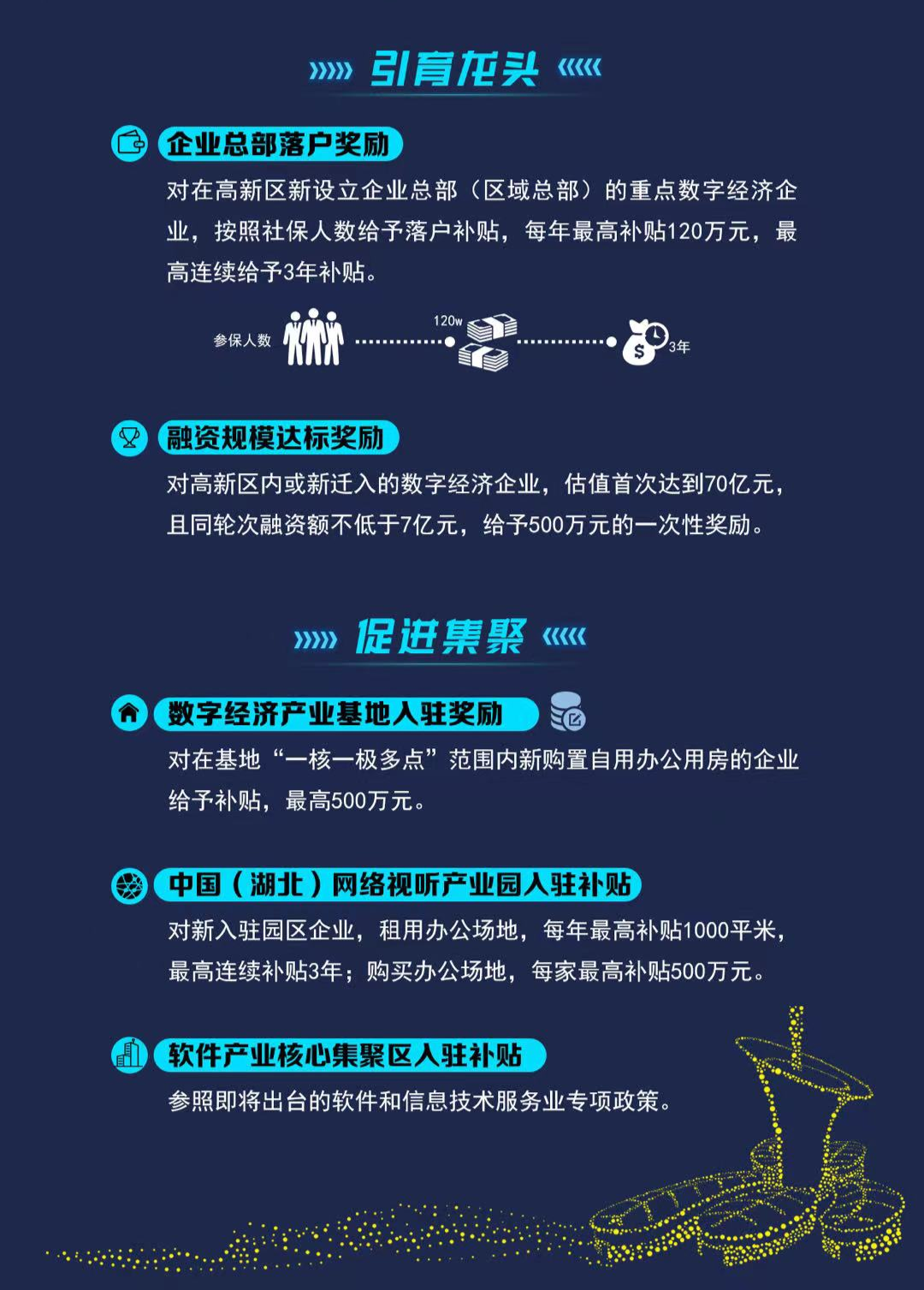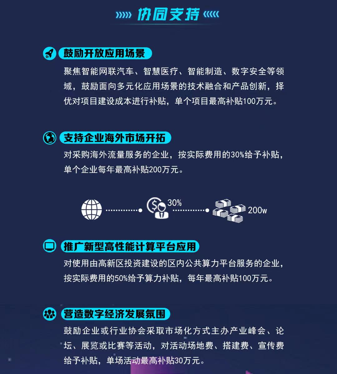 鼓勵重點數字經濟企業總部落戶,通過社保人數掛鉤獎補,每月每人500元,單家企業每年最高補貼可達120萬元,獎補最高持續3年,引導企業在區內設置更多就業崗位。